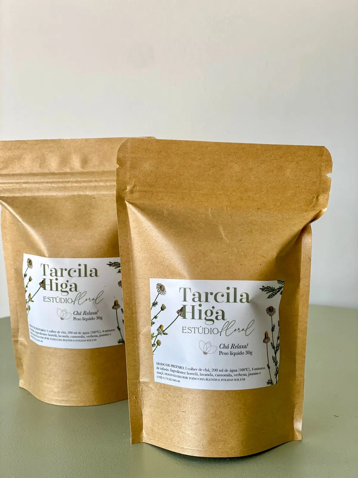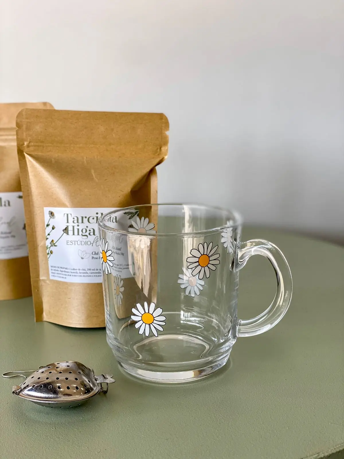 O nosso chá é uma receita desenvolvida para nós e sua composição leva: hortelã, lavanda, camomila, verbena, jasmim e maçã.