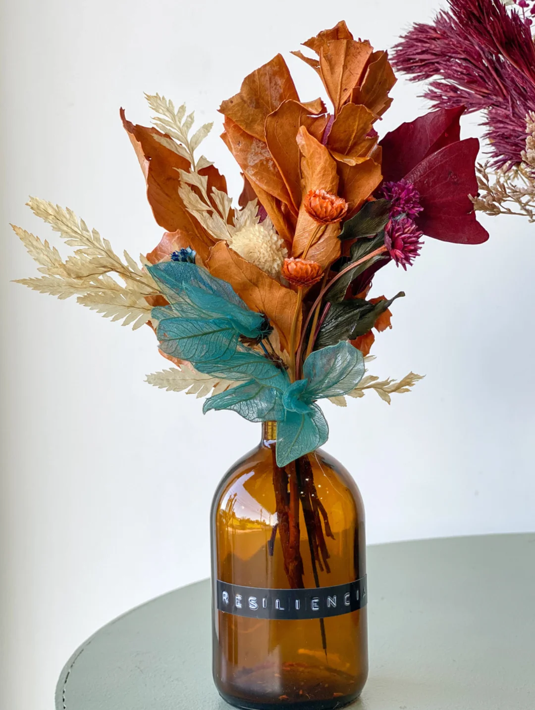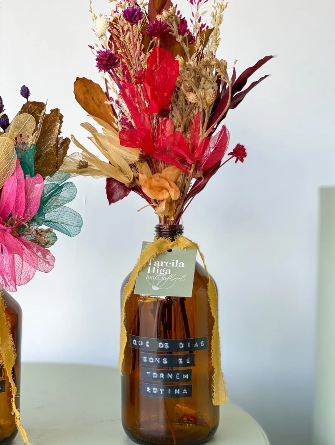Este trabalho é desenvolvido com flores e folhagens naturais desidratadas que passaram por um longo processo totalmente artesanal de secagem.