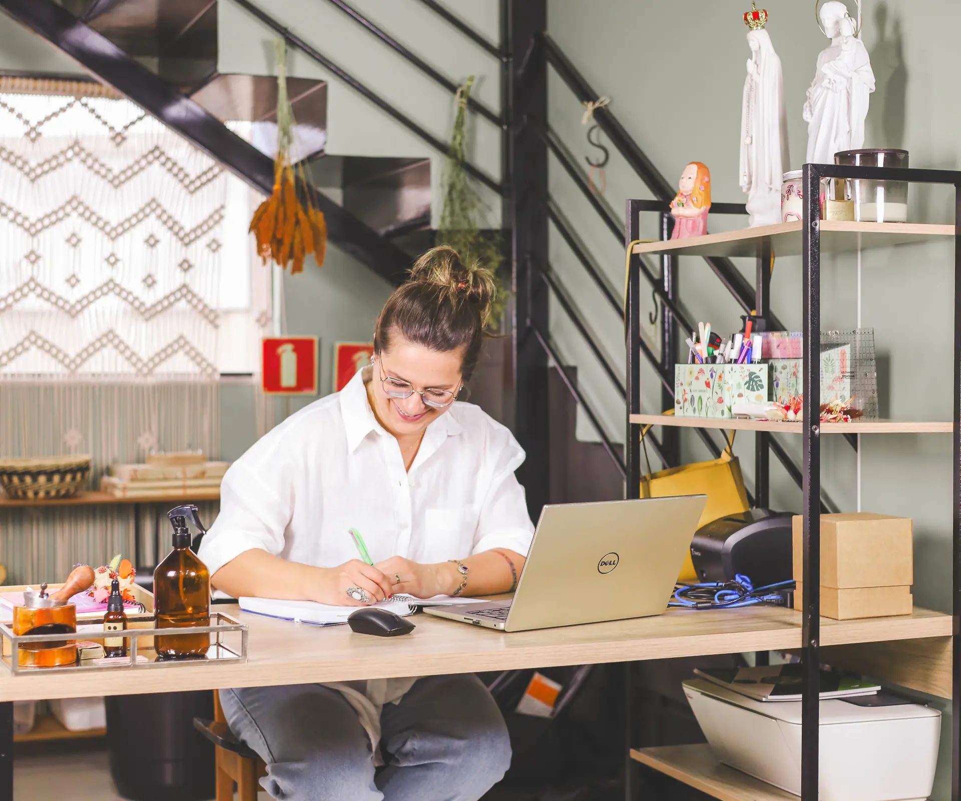 No estúdio temos produtos disponíveis a pronta entrega e também a linha de produção, que se concentra no coração do espaço, assim, quem chega para buscar suas encomendas, consegue acompanhar um pouquinho da nossa produção. Eu digo que é uma baguncinha boa, cheia de vida e cor!